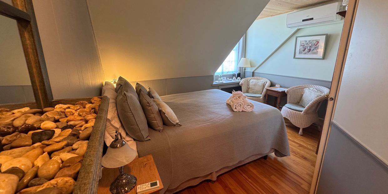Cette chambre dispose de meubles anciens et d'une salle de bains privative avec vue partielle sur le Mont-Orford et sur le Lac Menphrémagog.