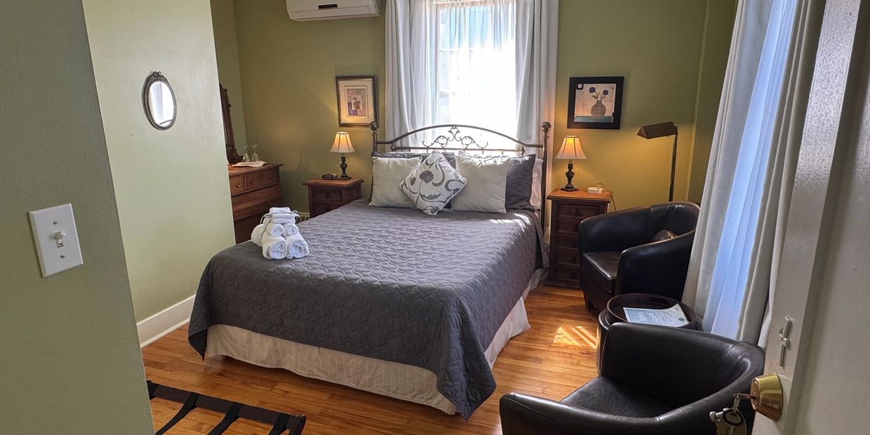 Cette chambre dispose de meubles anciens et d'une salle de bains privative avec vue partielle sur le Mont-Orford et sur le Lac Menphrémagog.
